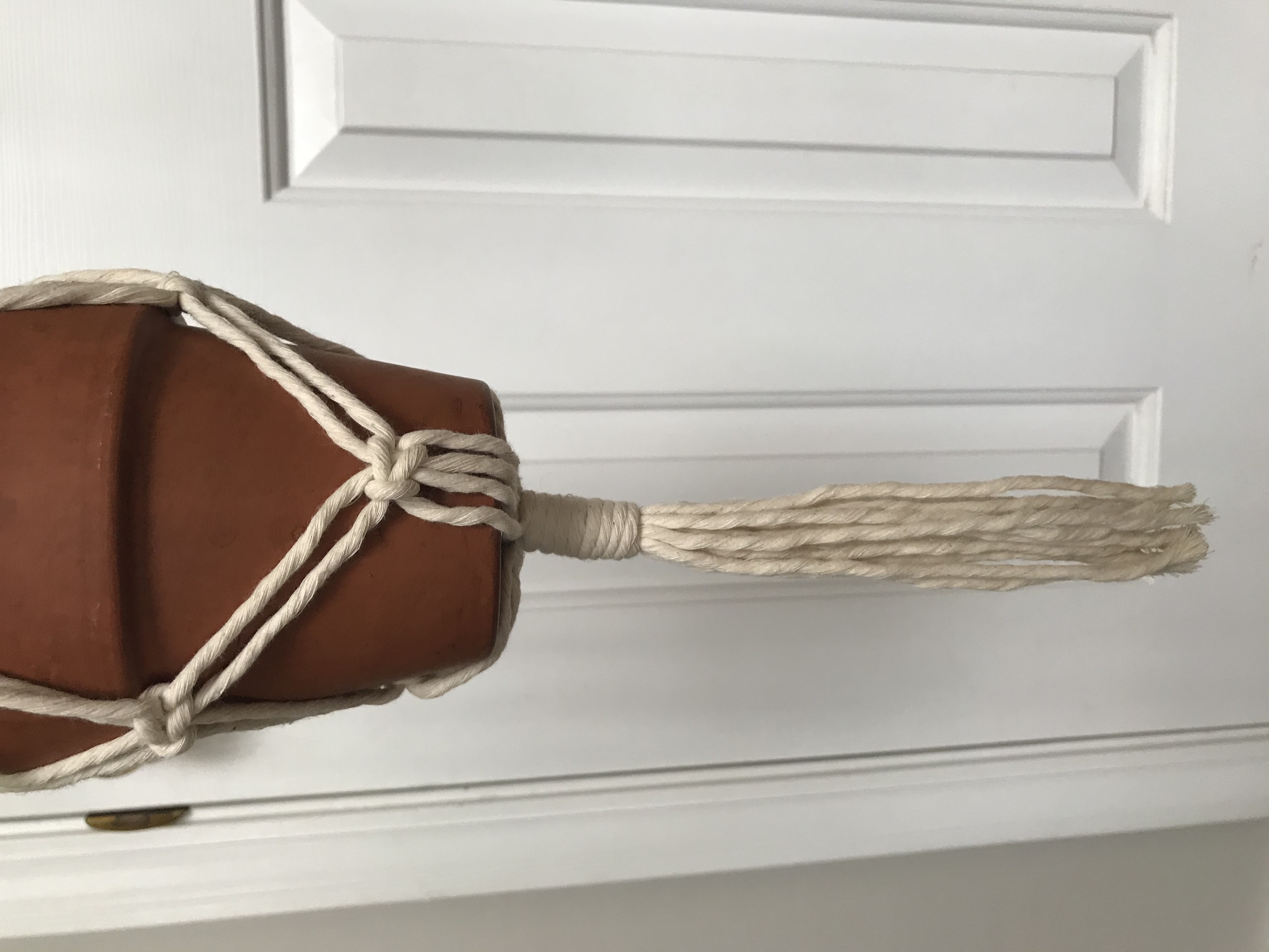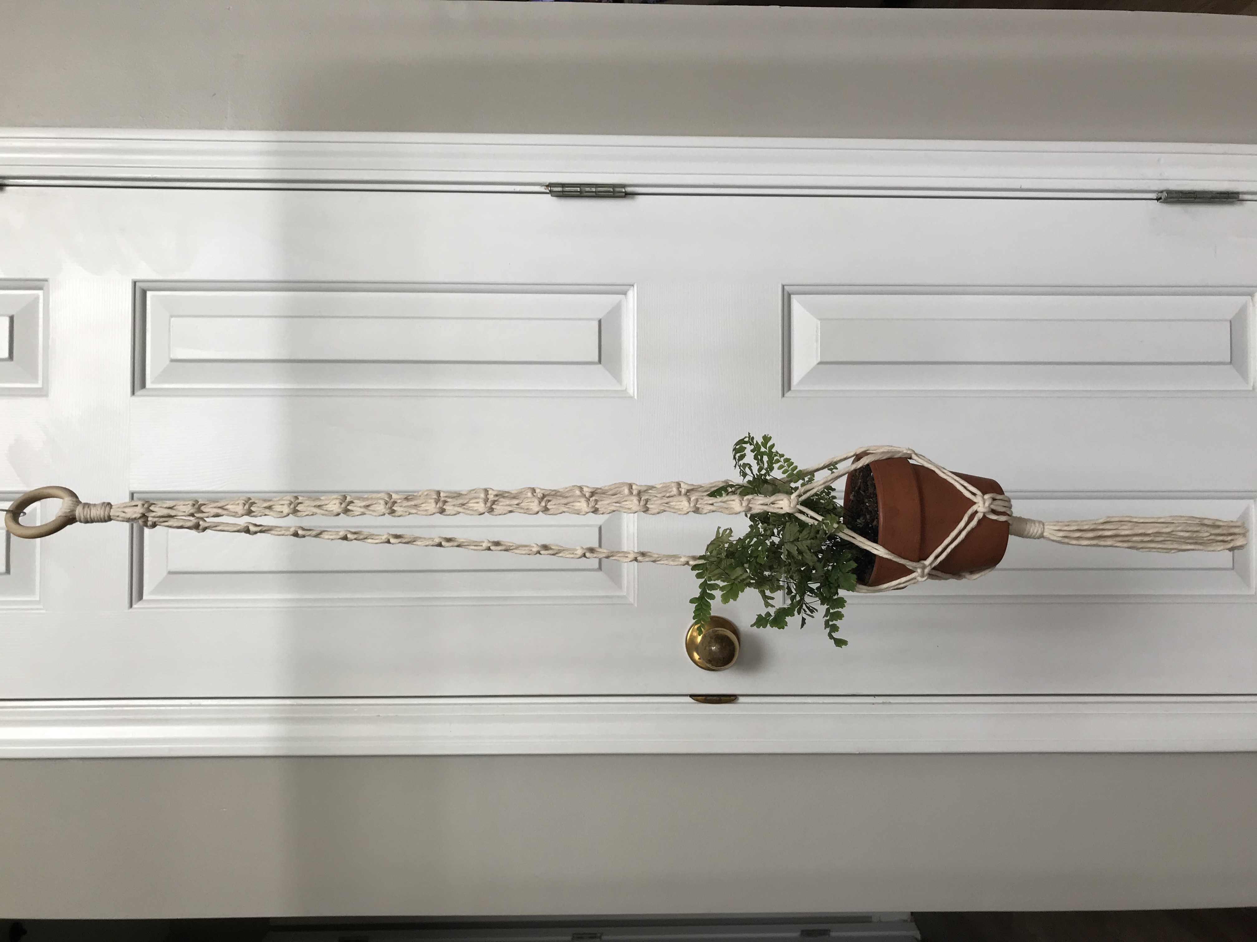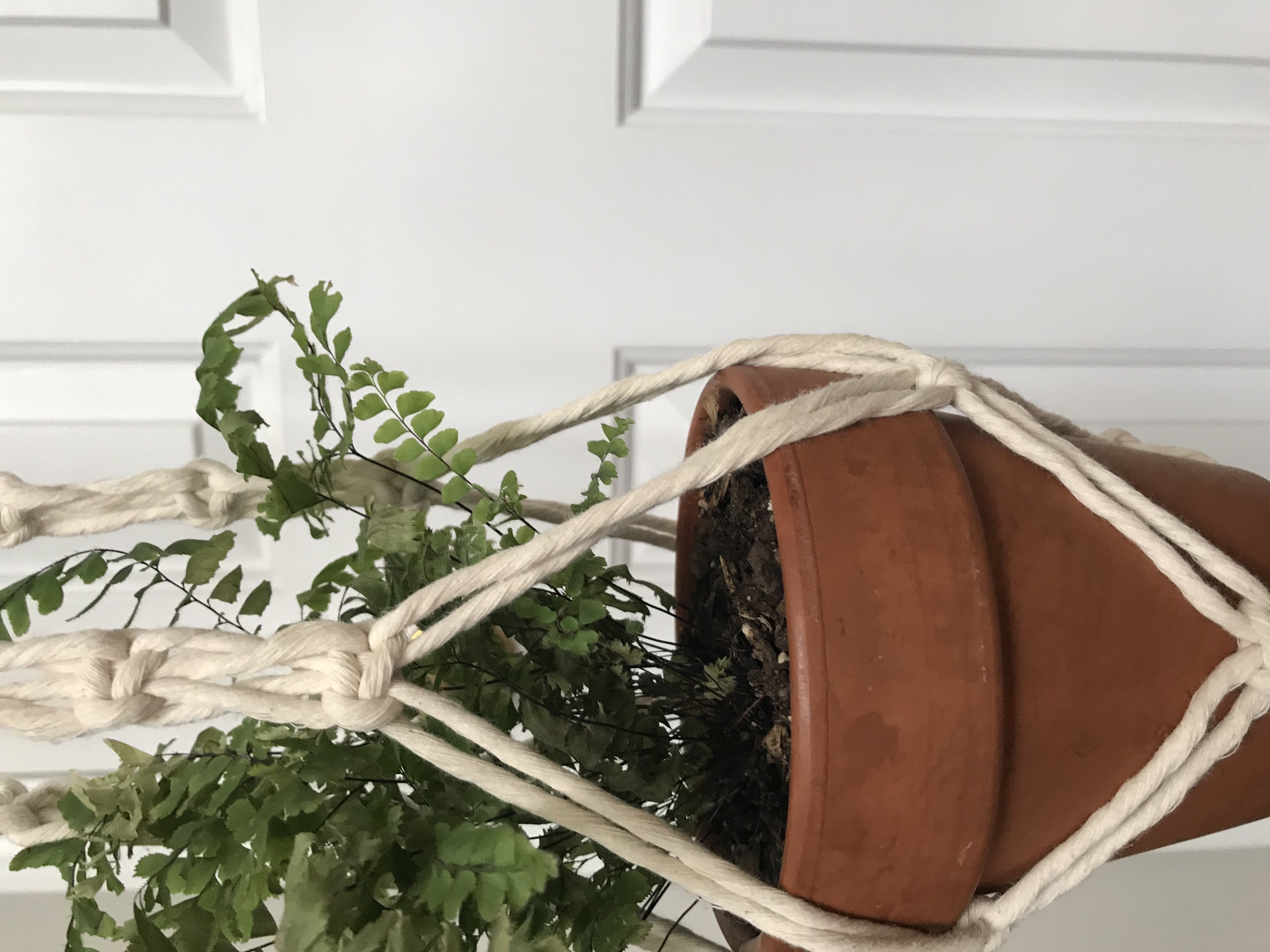This neat plant hanger features three sections with crossed up square knots and a long, even tail.
