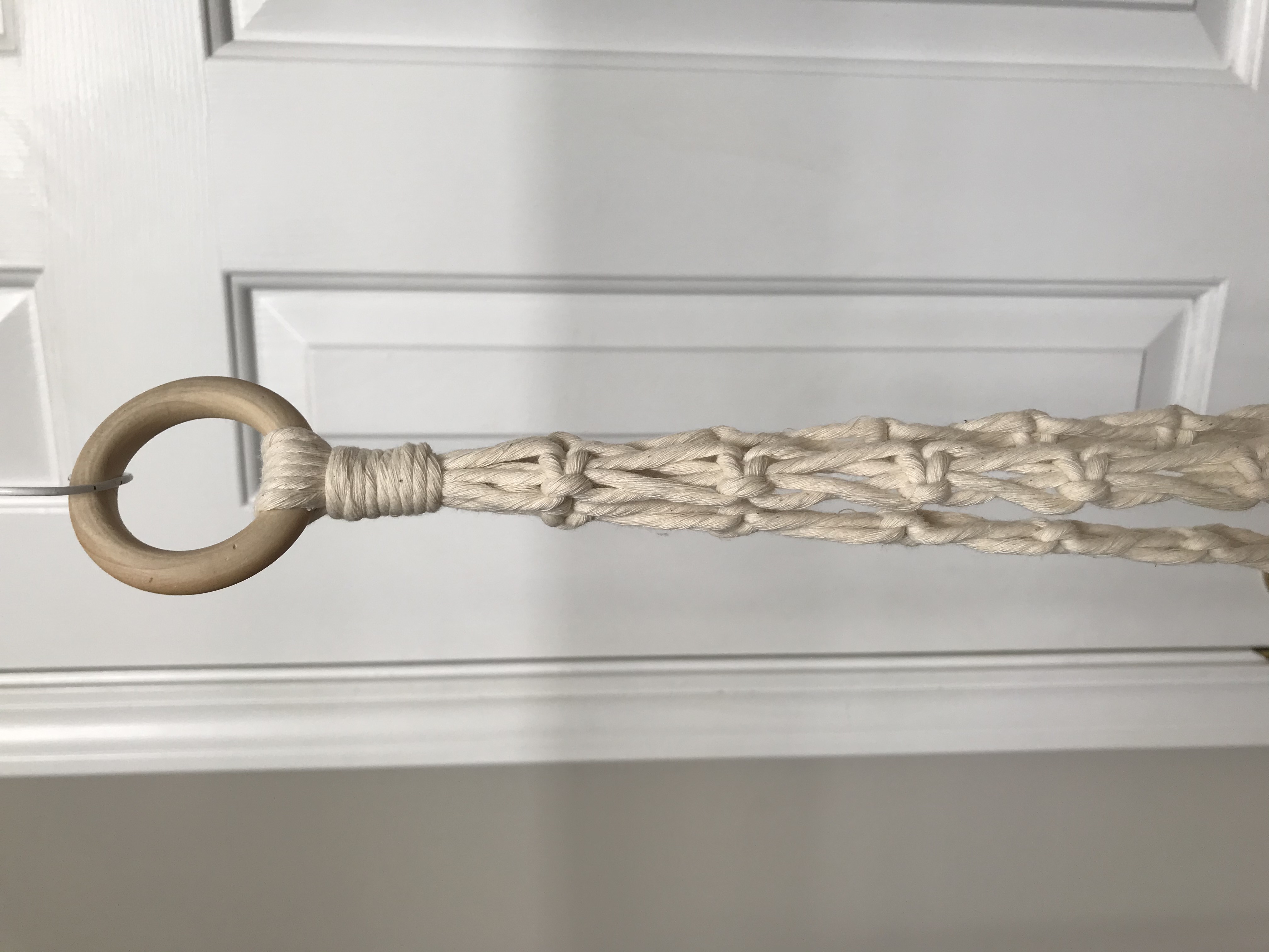 Hung on a light-toned wooden ring, this plant hanger fits a variety of small to medium sized pots.